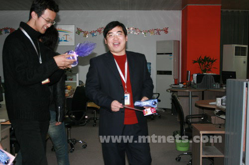 明通公司9月生日的员工一起分享生日蛋糕,握着特殊的礼物,彼此送出生日的祝福!