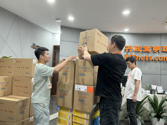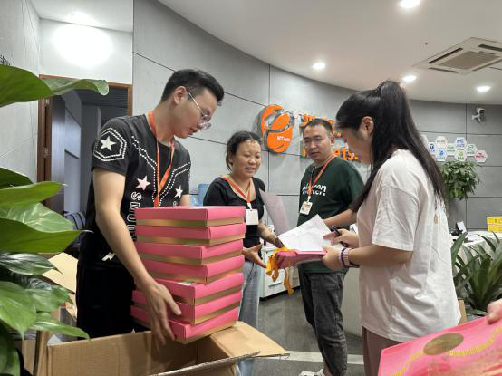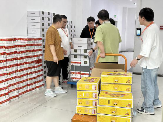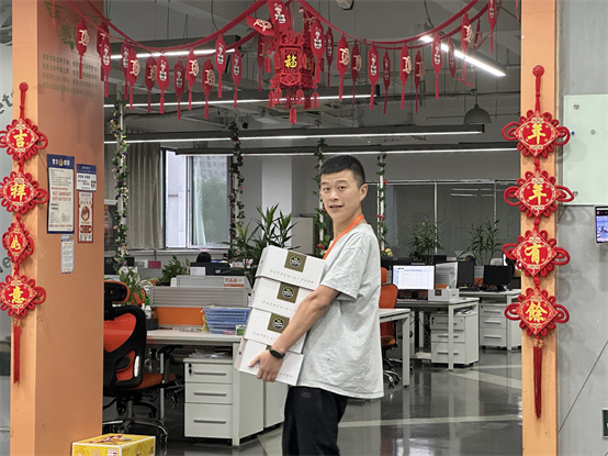 为保证中秋福利及时发放,公司将礼品一一搬至前台,各部门员工陆续前来,推着推车搬运礼品,行政部人员仔细清点,绝不漏掉每一个小伙伴的礼品,现场欢声笑语一片,洋溢着浓浓的节日氛围。