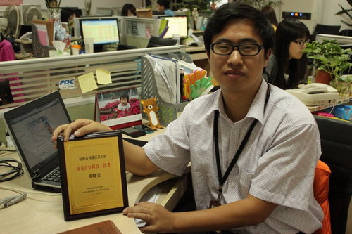 继罗君、老王之后,产品中心的董晓贵也荣获“西湖区优秀青年科技工作者”这一殊荣,晓贵是贵州遵义人,早前来杭州打拼,09年5月份来到明通的,他戴着一副大框眼睛,外表看起来有点像刚大学毕业似的,笑起来也比较年轻的感觉,其实他已经是孩子他爸了。