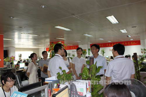 王处一行在陈总等人的陪同下参观了公司技术部、市场部、服务部、编辑部等办公区域,对公司的发展规模表示赞赏。陈总详细介绍了公司各职能部门的主要工作和业绩,讲解了公司近几年的发展历程和增长数据。王处鼓励明通发挥公司核心优势,继续保持这样高速发展的势头,杭州信息服务业的发展需要明通这样有实力的科技企业。